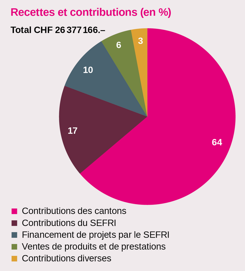 Les recettes du CSFO provenaient principalement des contributions cantonales (CHF 16,8 millions; 64%, financement de projets compris) et du SEFRI (CHF 7,2 millions; 27%). CHF 1,5 million résultait de la vente de produits et de prestations.