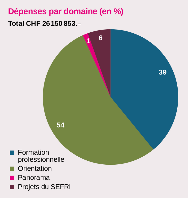 Les charges étaient imputables au domaine de la formation professionnelle à hauteur de 39%, au domaine de l’orientation à raison de 54%, à Panorama pour 1% et aux projets du SEFRI à hauteur de 6%.