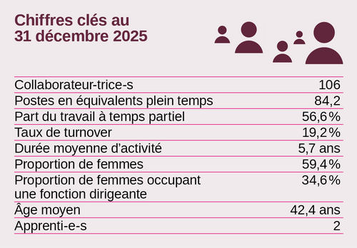 La participation des collaborateur-trice-s à la formation continue est restée élevée. En termes d’équivalents plein temps, cela représentait 195 jours. En outre, 25 collaborateur-trice-s (26,6% de l’effectif) ont suivi un perfectionnement individuel, cela avec le soutien du CSFO.