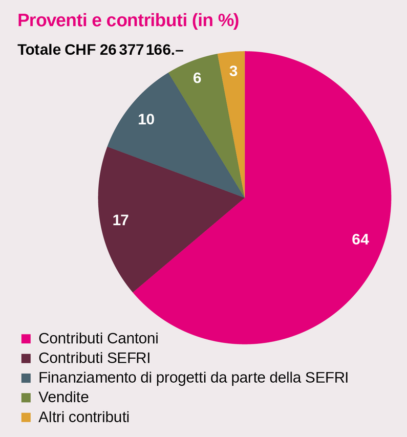 I contributi versati dai Cantoni, pari a circa 16,8 milioni di franchi (64%, incluso il finanziamento di progetti), e dalla Segreteria di Stato per la formazione, la ricerca e l’innovazione (SEFRI), pari a circa 7,2 milioni di franchi (27%), hanno rappresentato la quota più importante delle entrate del CSFO. Circa 1,5 milioni di franchi sono stati ricavati dalla vendita di prodotti e servizi.